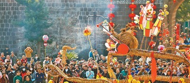 1月23日,安徽省黄山市歙县徽州古城举行非遗、民俗展演活动,吸引众多市民游客观看,年味浓浓。图为“洪琴草龙”在古城巡游。